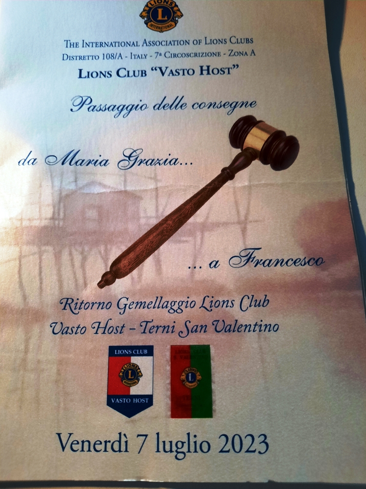 7-8-9 luglio 2023 il Past Presidente Giuseppe Fatati, Adolfo Puxeddu, Pietro Pallini con Sig.ra Marina e Anna Chielli hanno partecipato a Vasto al passaggio della campana del club gemellato Vasto Host. La gita, ottimamente organizzata dal Club di Vasto, ha previsto nel pomeriggio una escursione alla Riserva Naturale di Punta Aderci, in località Punta Penna, uno dei posti più caratteristici della costa Vastese.