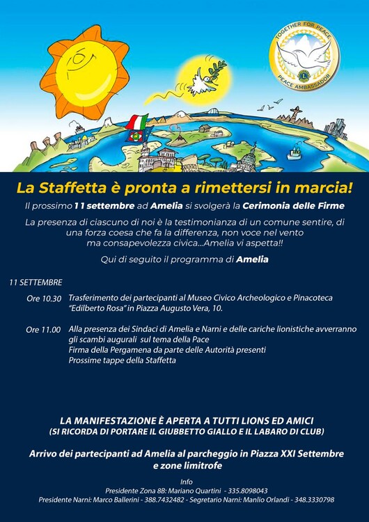 11 settembre 2024 il Presidente Benigno Riso, Mariano Quartini e sig.ra Patrizia, Anna Chielli hanno partecipato ad Amelia presso il Museo Archeologico, con i club Terni Interamna, Narni e due Club di Roma alla manifestazione“ Staffetta della Pace”.